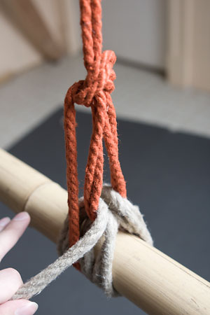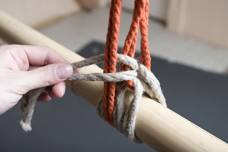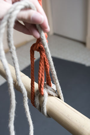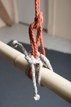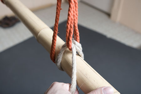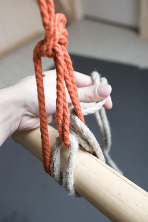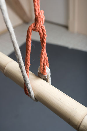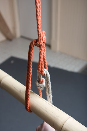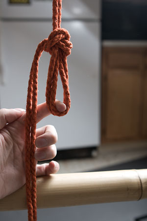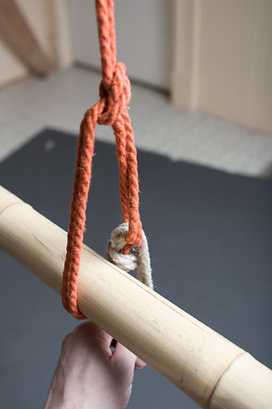Next, you want to adjust the loop so that it ends just a little bit above the top of the column, by pulling rope through the knot to elongate (or, if necessary, shorten) it; this is also your last chance to adjust the overall tension on the tie: