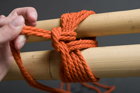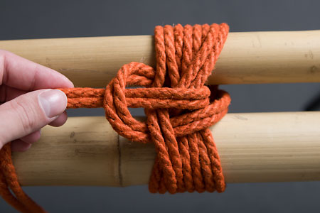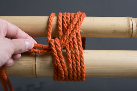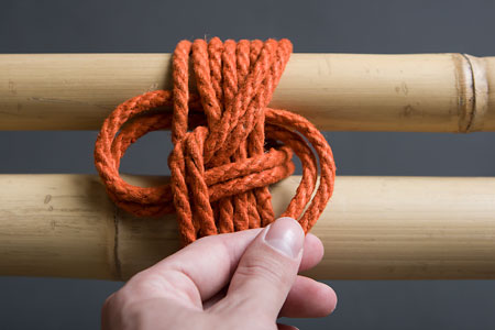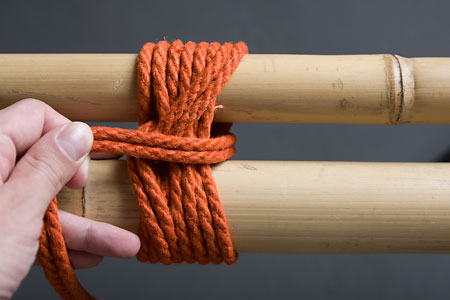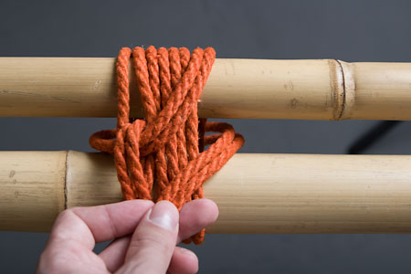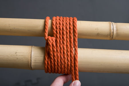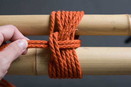 At this point, there are several ways to finish it off. One is to split the lines around the front of the cuff and tie a square knot; that doesn't require much space between the columns, but had the disadvantage of only pulling on the back of the cuff, which can make it feel like it's tightening under tension. An alternate approach is to now hitch off the front of the cuff, similar to the single-column version, by first passing through the starting doubled-rope bight:
